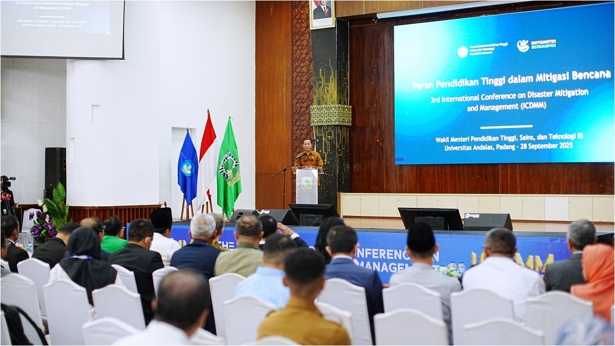 Padang (UNAND) – Wakil Menteri Pendidikan Tinggi, Sains, dan Teknologi (Wamen Diktisaintek) Prof. Fauzan menyampaikan apresiasi kepada Universitas Andalas (UNAND) atas penyelenggaraan konferensi kebencanaan yang mengangkat tema “Bersiap Menghadapi Megathrust”. Menurutnya, kegiatan ini adalah wujud nyata komitmen UNAND dalam melayani masyarakat melalui ilmu pengetahuan dan riset yang berdampak langsung.