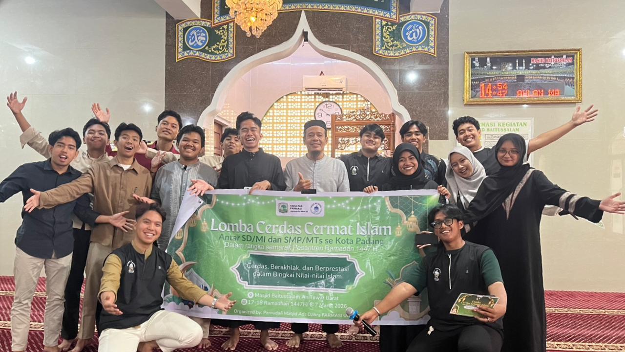 Padang (UNAND) — Pemuda Masjid Adz Dzikra Fakultas Farmasi Universitas Andalas sukses menyelenggarakan Lomba Cerdas Cermat Islam (LCCI) Kota Padang 2026 bagi pelajar tingkat SD/MI dan SMP/MTs se-Kota Padang. Kegiatan ini digelar dalam rangka memeriahkan Pesantren Ramadhan Kota Padang sekaligus meningkatkan pengetahuan serta pemahaman generasi muda terhadap nilai-nilai keislaman.