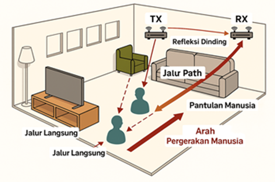 Channel State Information (CSI) merupakan kunci utama dalam WiFi Sensing. CSI adalah informasi detail tentang bagaimana sinyal WiFi merambat dari pemancar ke penerima. CSI mengandung informasi berupa amplitudo kanal, fase kanal, respons frekuensi pada setiap subcarrier, informasi antenna (MIMO state), delay spread dan multipath, informasi doppler efek, dan fitur-fitur statistical. Berbeda dengan RSSI (Received Signal Strength Indicator) yang bersifat kasar, CSI jauh lebih kaya informasi yang berasal dari amplitudo kanal. Ia mampu menangkap perubahan kecil akibat: pergerakan manusia, perubahan posisi objek, bahkan gestur tubuh. Inilah sebabnya CSI menjadi fondasi utama berbagai aplikasi wireless sensing berbasis WiFi.