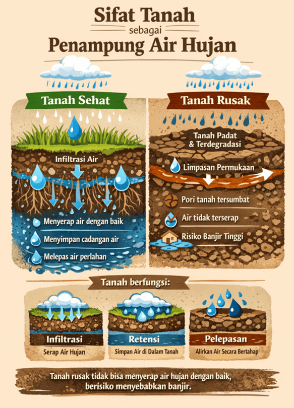 Ketika tanah terdegradasi, porositas menurun dan konduktivitas hidraulik terganggu maka air hujan tidak lagi terinfiltrasi secara efektif, melainkan berubah menjadi limpasan permukaan atau perkolasi tak terkendali, yang pada akhirnya meningkatkan risiko banjir, gerakan massa tanah, serta degradasi lingkungan.